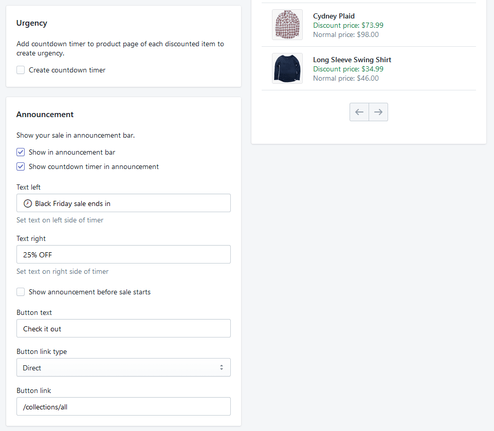Check, if you want to show this sale in the announcement bar. - Show countdown timer in announcement