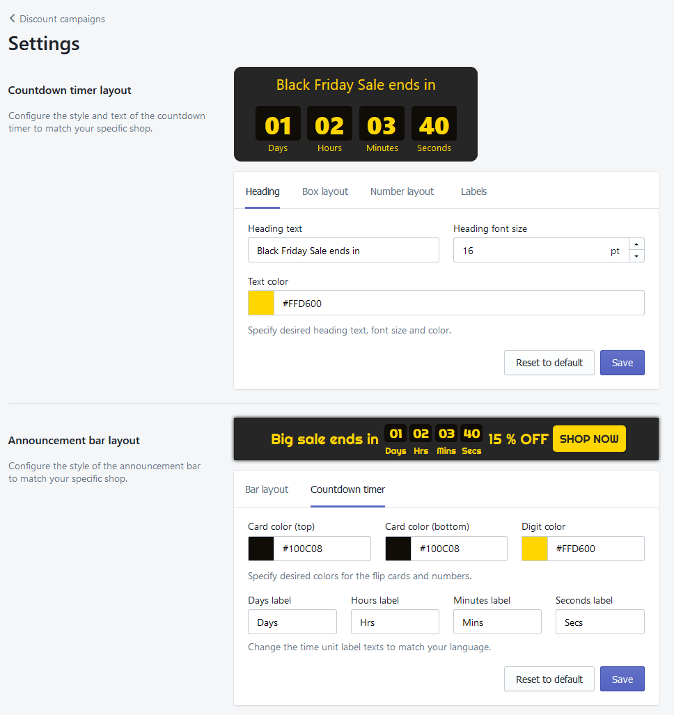 You can customize the layout of the announcement bar and countdown timer to fit perfectly into your store theme by going to Settings from the app front page.